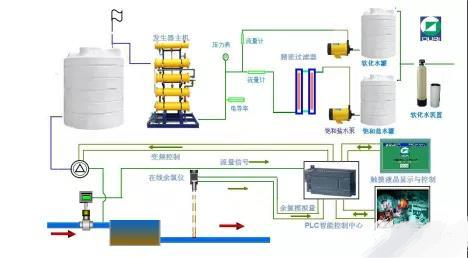 電解鹽水型次氯酸鈉發生器的電解過程是一個電化學的反應過程,它的原材料是鹽水(非飽和,工業精鹽),沒有別的任何附加成份,制成次氯酸鈉溶液品質純凈,其工藝流程如圖3所示