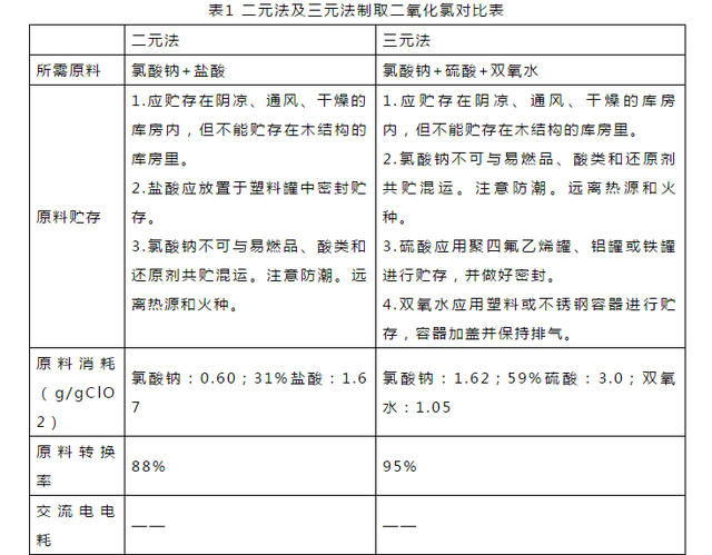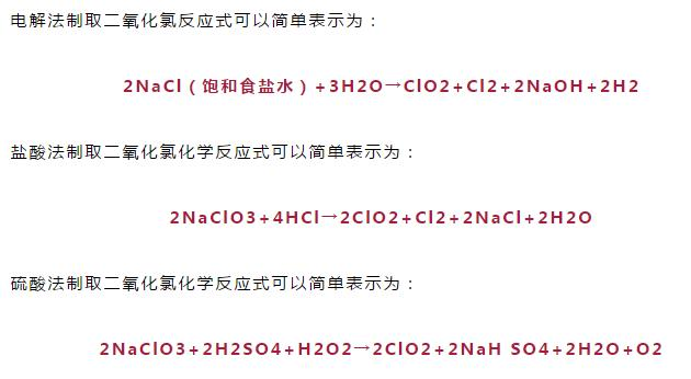 上述反應式除電解法外,原料并不單一,如雙氧水可以用蔗糖代替,但反應式會相應改變,氯酸鈉也有使用亞氯酸鈉作為原料的。