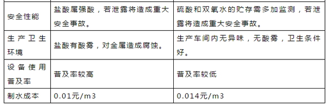 鹽酸法及硫酸法(均采用氯酸鈉為原料)對比如表1所示(由于污水性質較為復雜,成本為某江段同原水,同工藝,同出廠余二氧化氯量所計算成本):