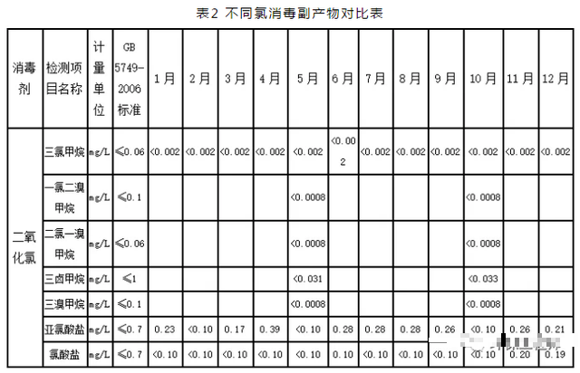 由表2可知,所有消毒方式副產物均能滿足GB5749-2006規范要求,其中:氯氣消毒產生了三氯甲烷、一氯二溴甲烷、二氯一溴甲烷、三鹵甲烷,氯酸鹽和亞氯酸鹽在大多的月份未檢出;次氯酸鈉消毒產生的副產物和液氯消毒基本相同,也產生了三氯甲烷、二氯一溴甲烷、三鹵甲烷,但含量略少于氯氣消毒,有些月份還產生一定量的亞氯酸鹽和氯酸鹽;二氧化氯消毒幾乎沒有檢出三氯甲烷、一氯二溴甲烷、二氯一溴甲烷、三鹵甲烷,但產生了氯酸鹽、亞氯酸鹽的消毒副產物。